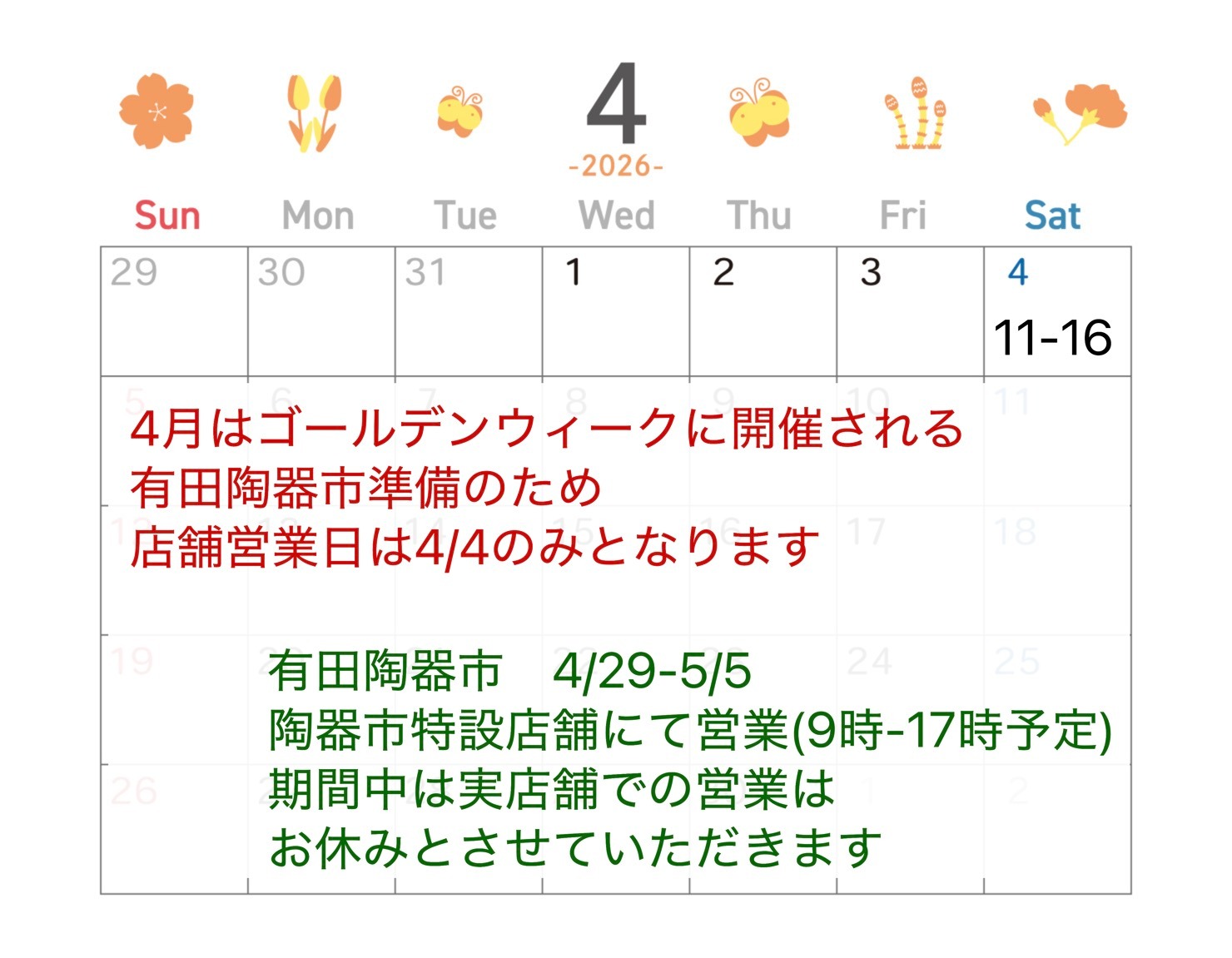 有田陶器市の準備のため4/4のみの営業となります。