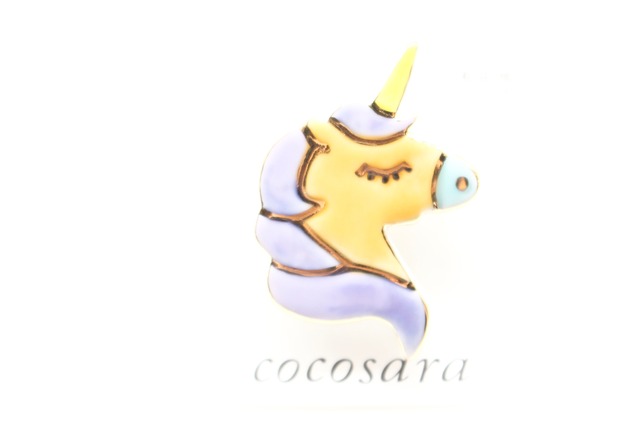 いろんな釉薬を使用してPOPなユニコーンになりました。 小さな女の子にもおすすめのブローチです。 素材:有田焼 幅:約3.0㎝ 高さ:約4.0㎝ 厚み:約5.0㎜ 重さ:約10.0g(金具含む) 絵付け:金彩(純金) ★商品ご購入の際は必ずご一読ください。 ~私たちの作品について。~ http://bit.ly/2YKWH25