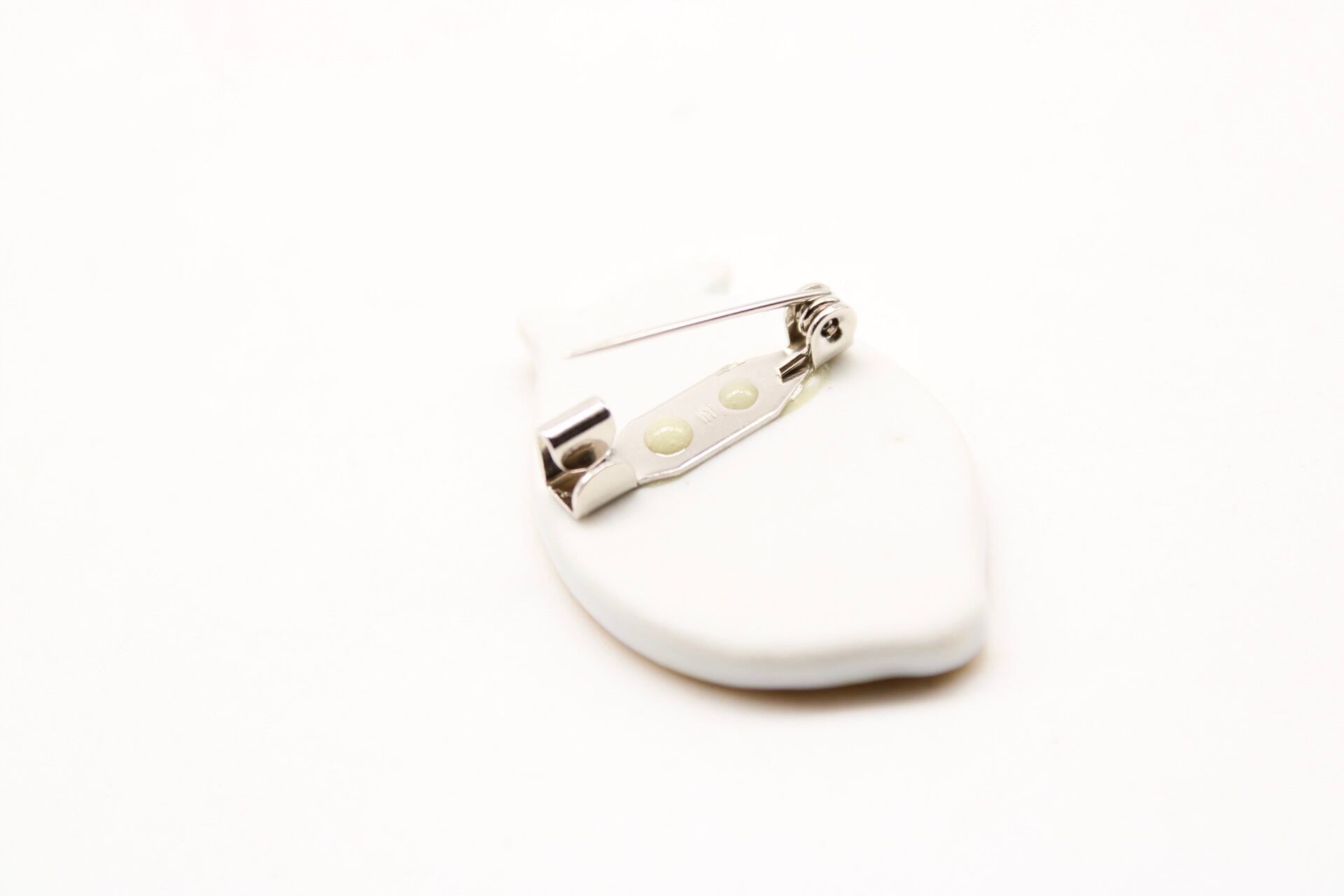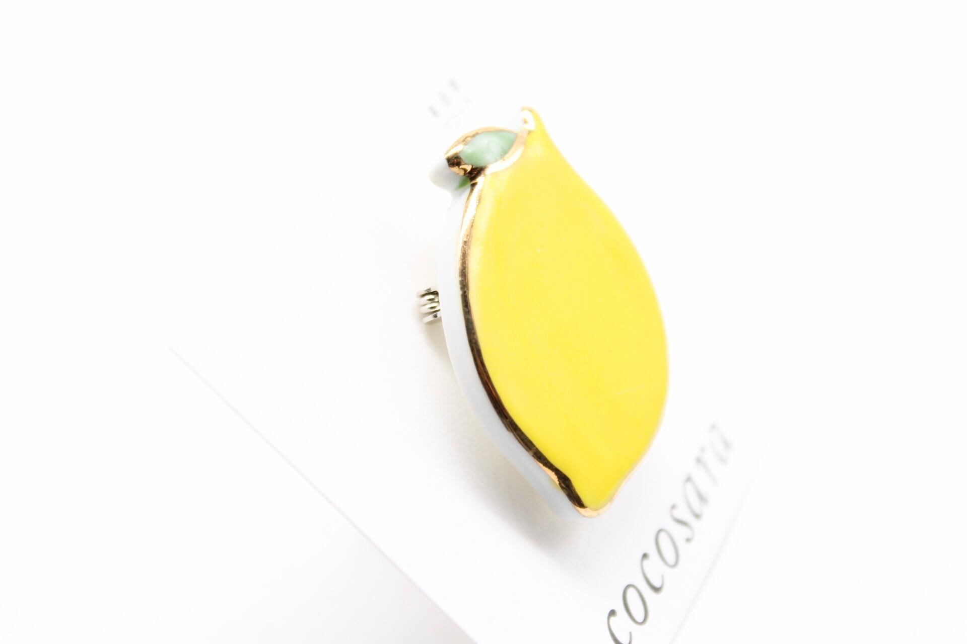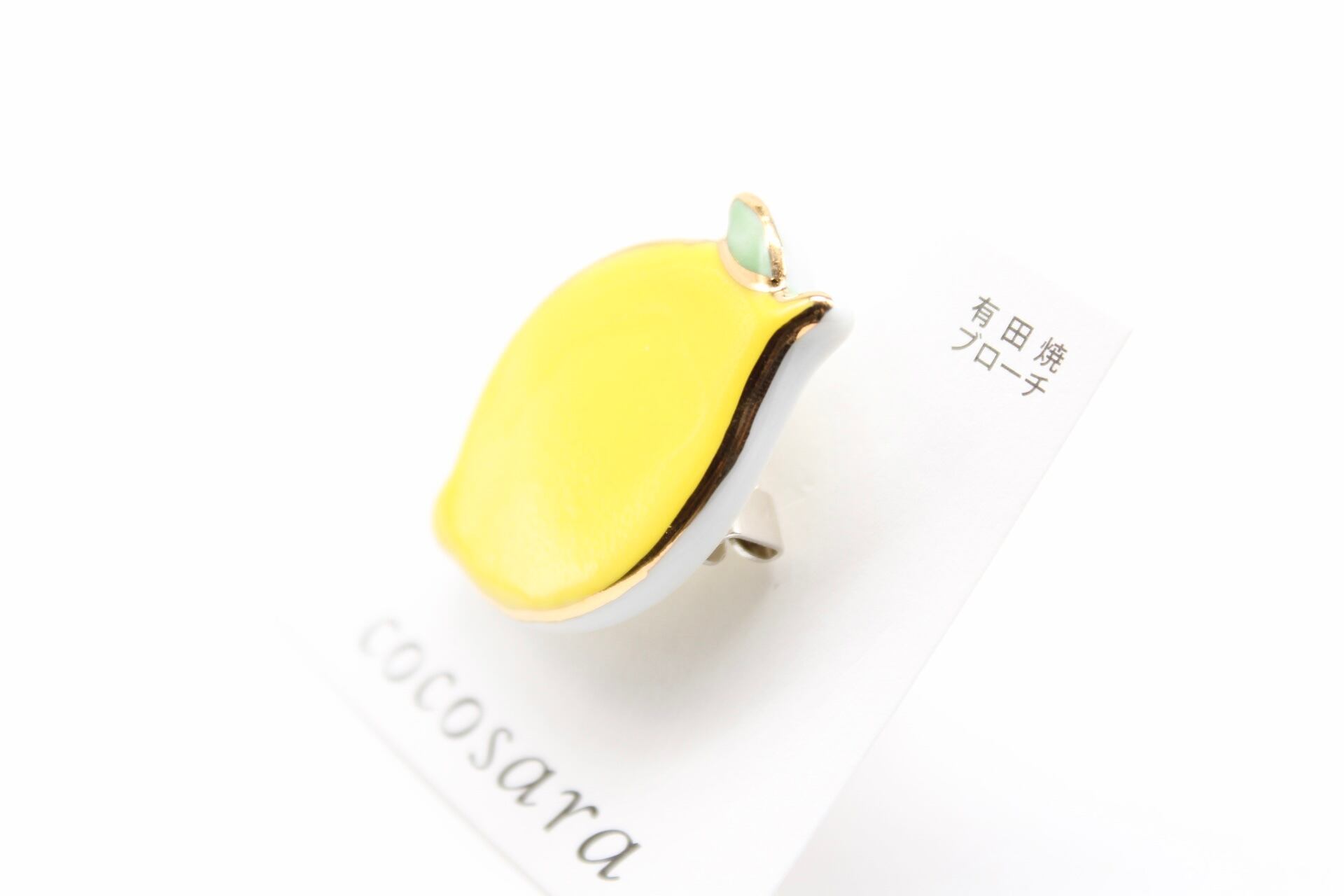 有田焼ブローチ レモンは、黄色いレモンが可愛らしいデザインのブローチです。有田焼ならではの繊細な手仕事で作られており、一つ一つが職人の手によって丁寧に作り上げられています。