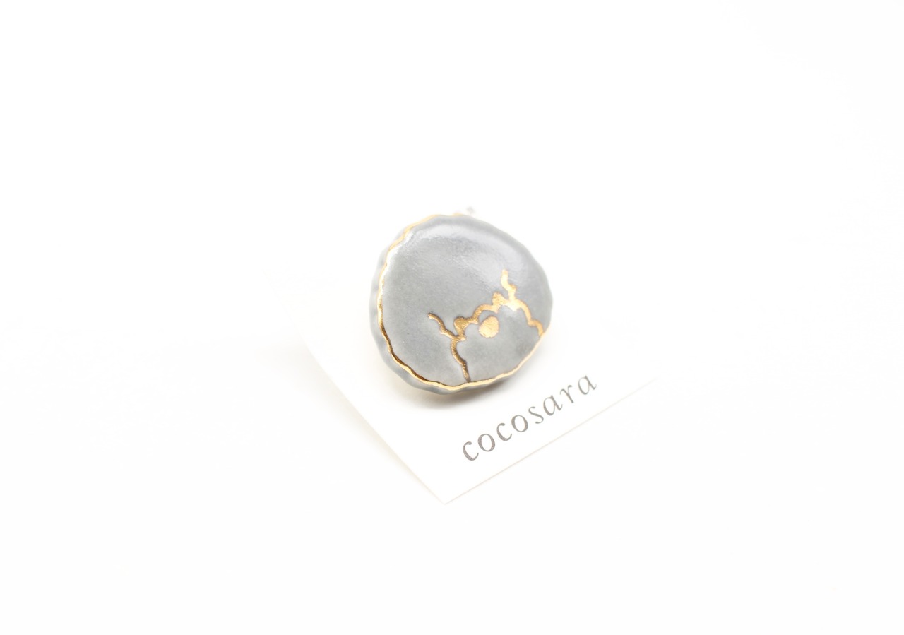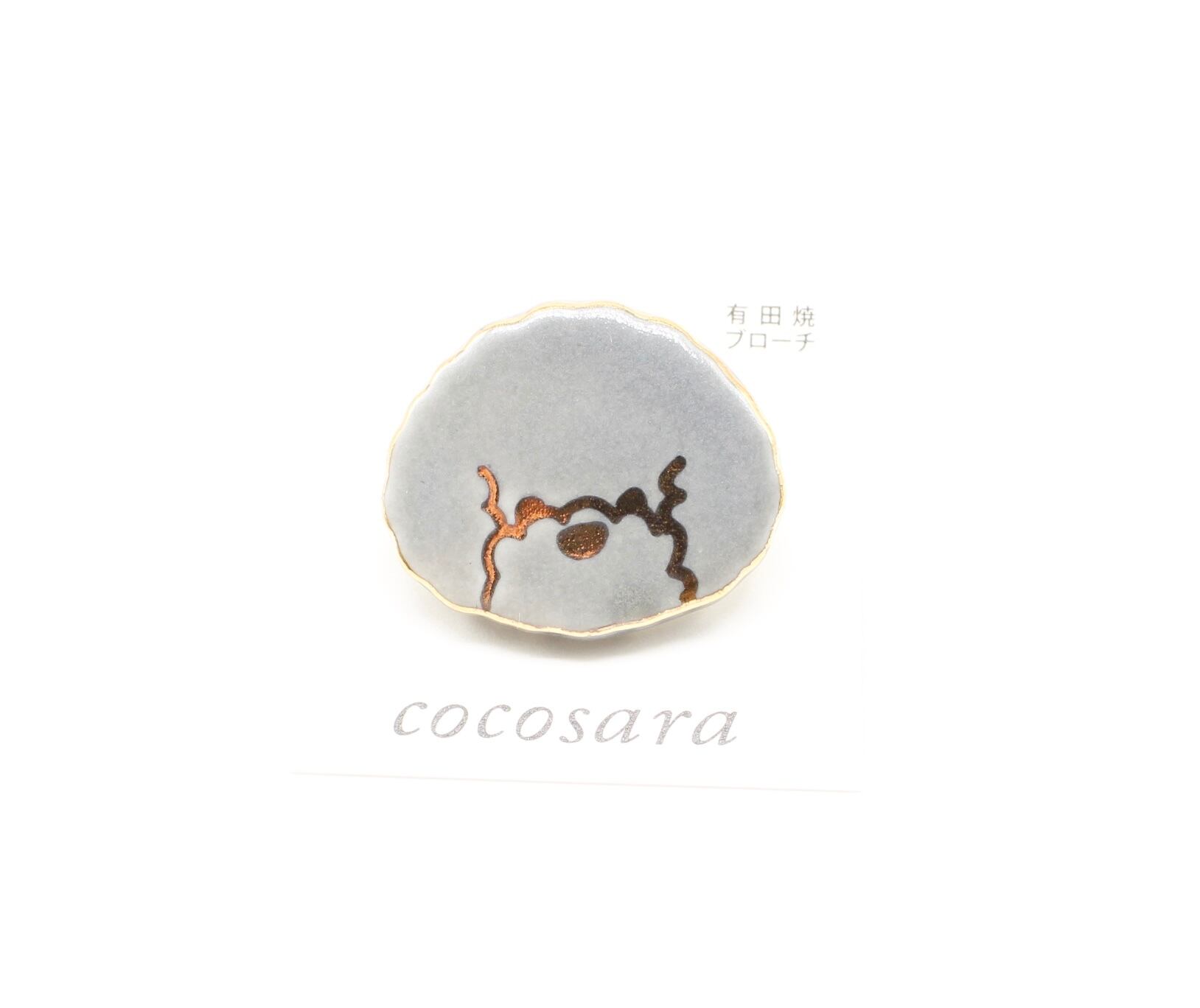 手のひらサイズのかわいらしい有田焼のプードルブローチです。グレーとゴールドの組み合わせが上品で、どんなコーディネートにも合わせやすい一品です。特に、ジャケットやコート、バッグなどのアクセントにピッタリ。