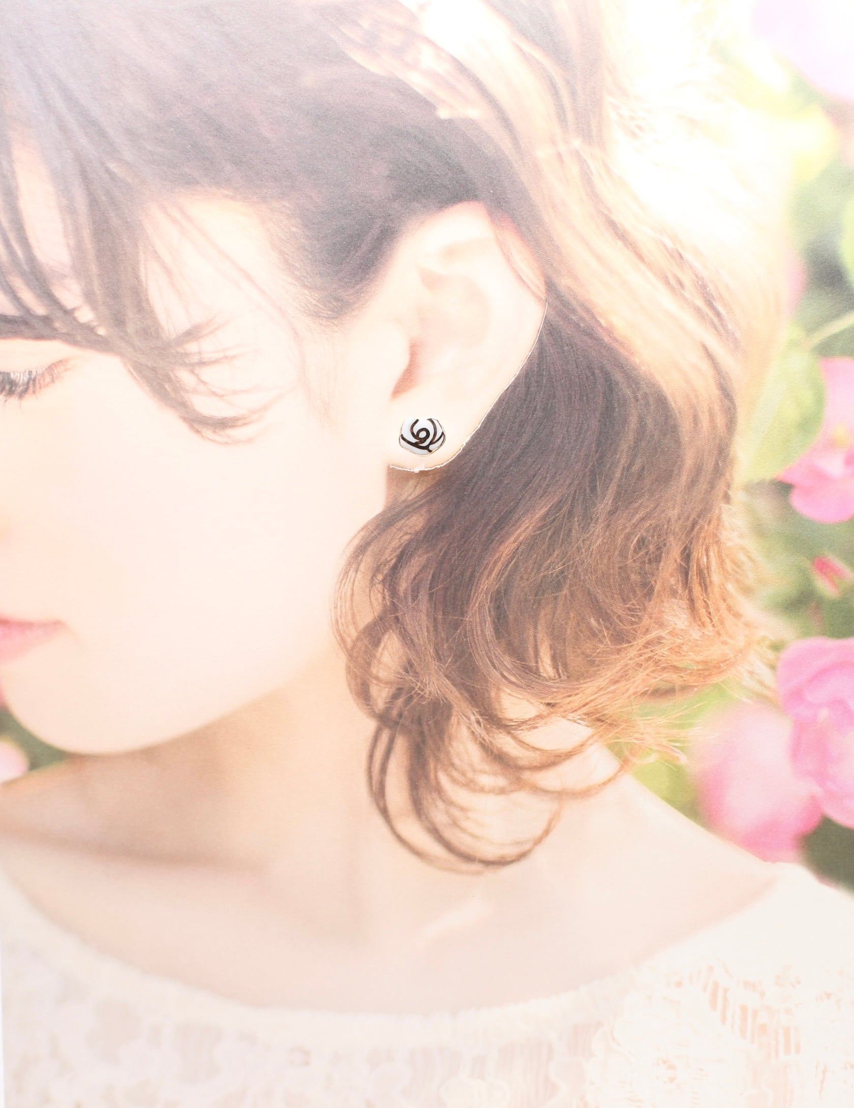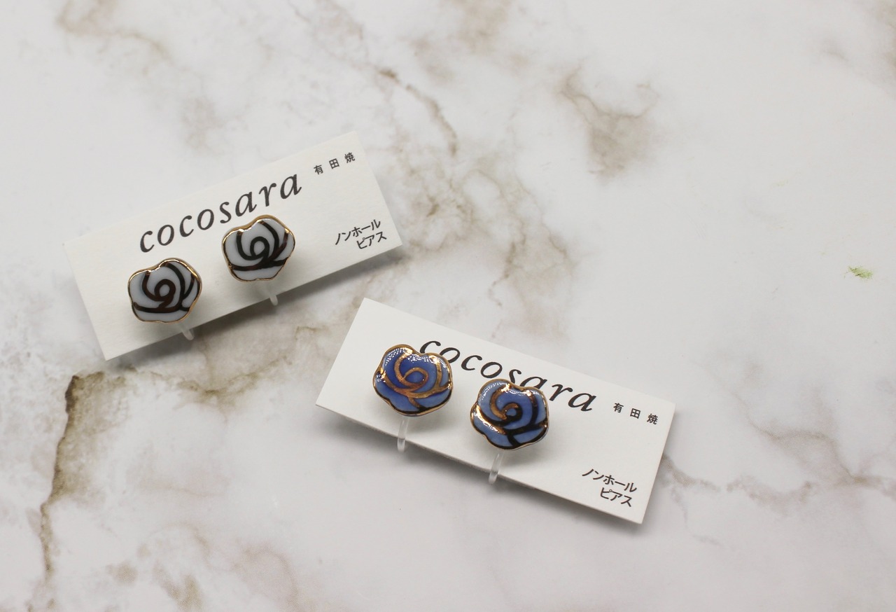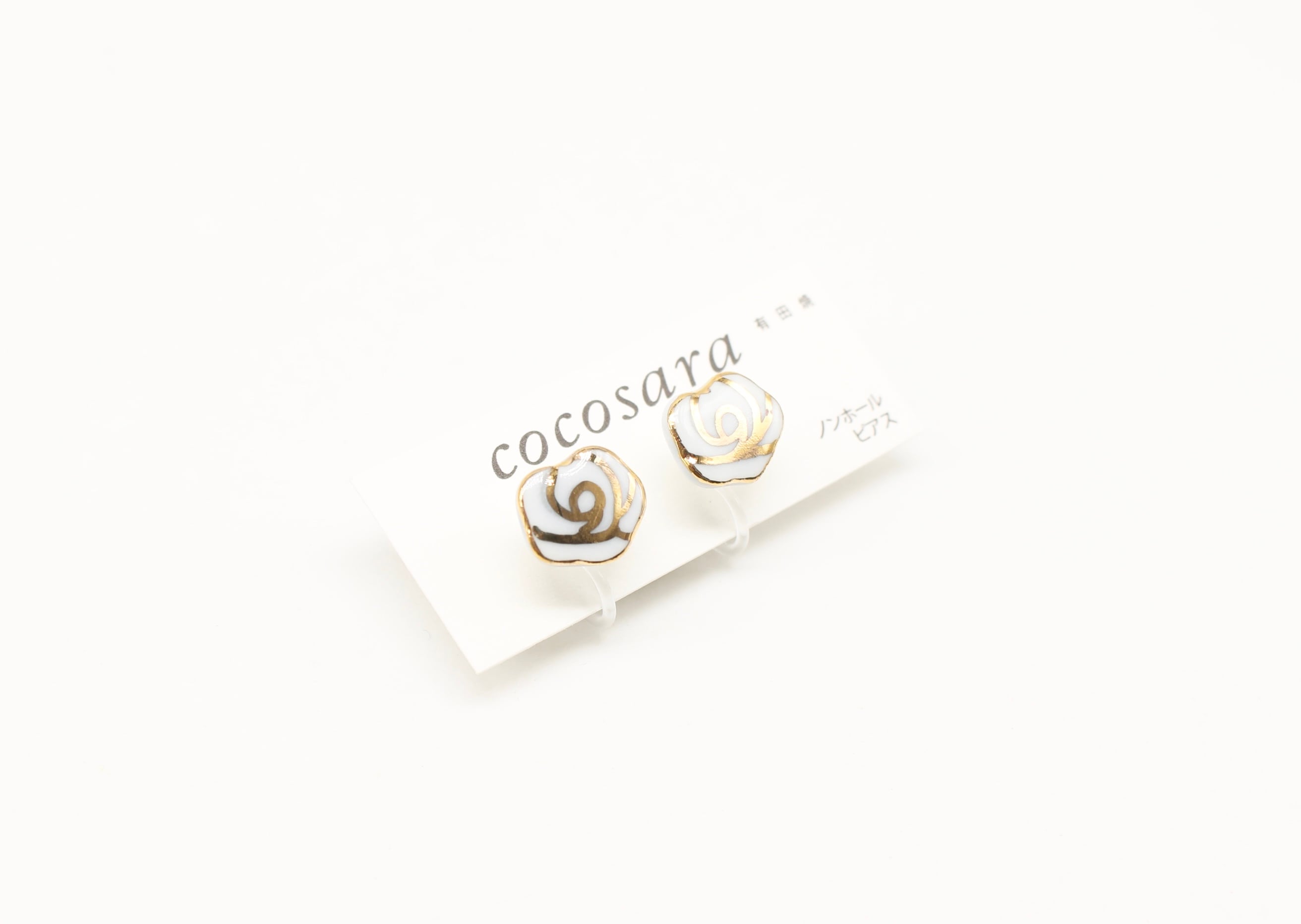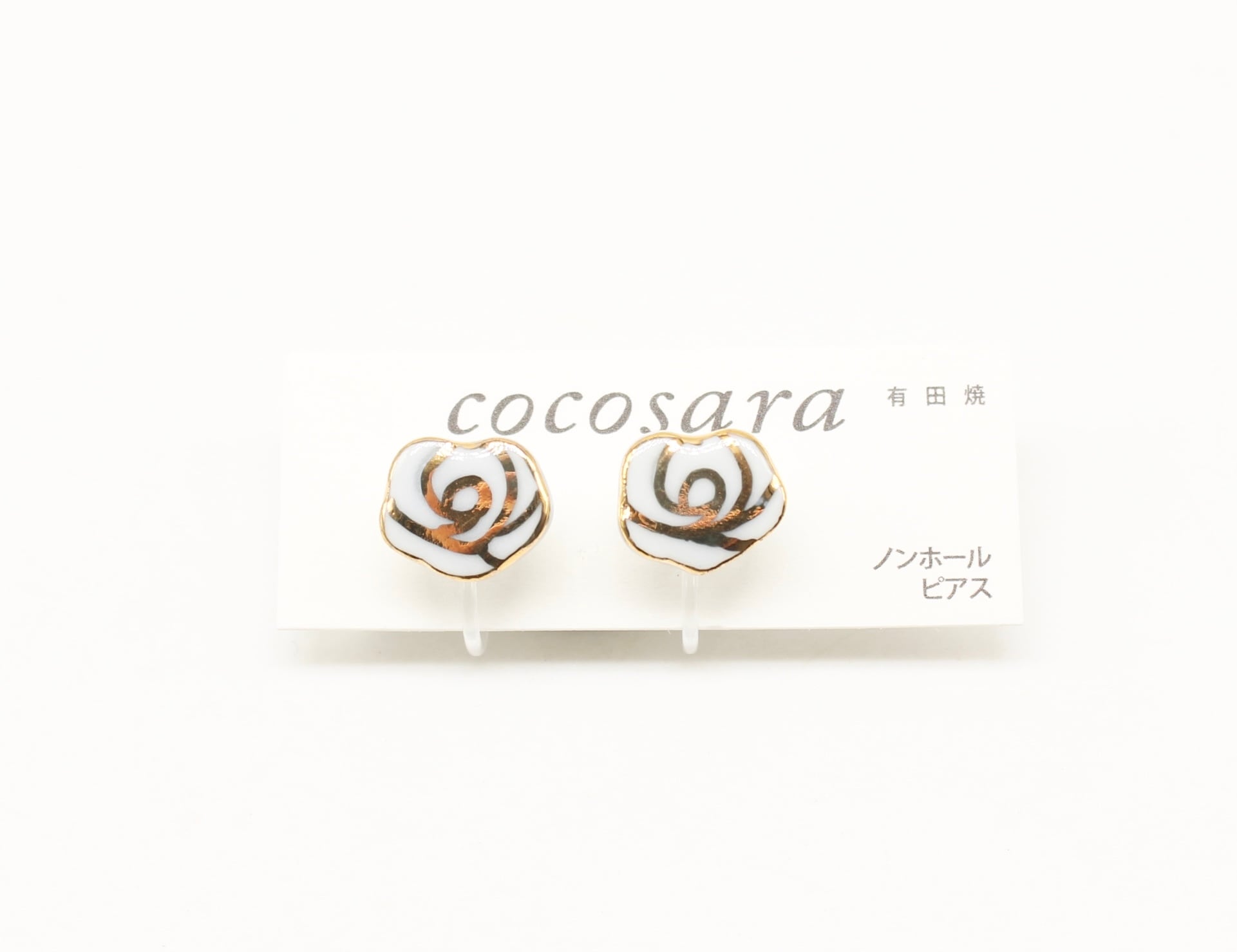 有田焼ノンホールピアス 手描き風バラ 白