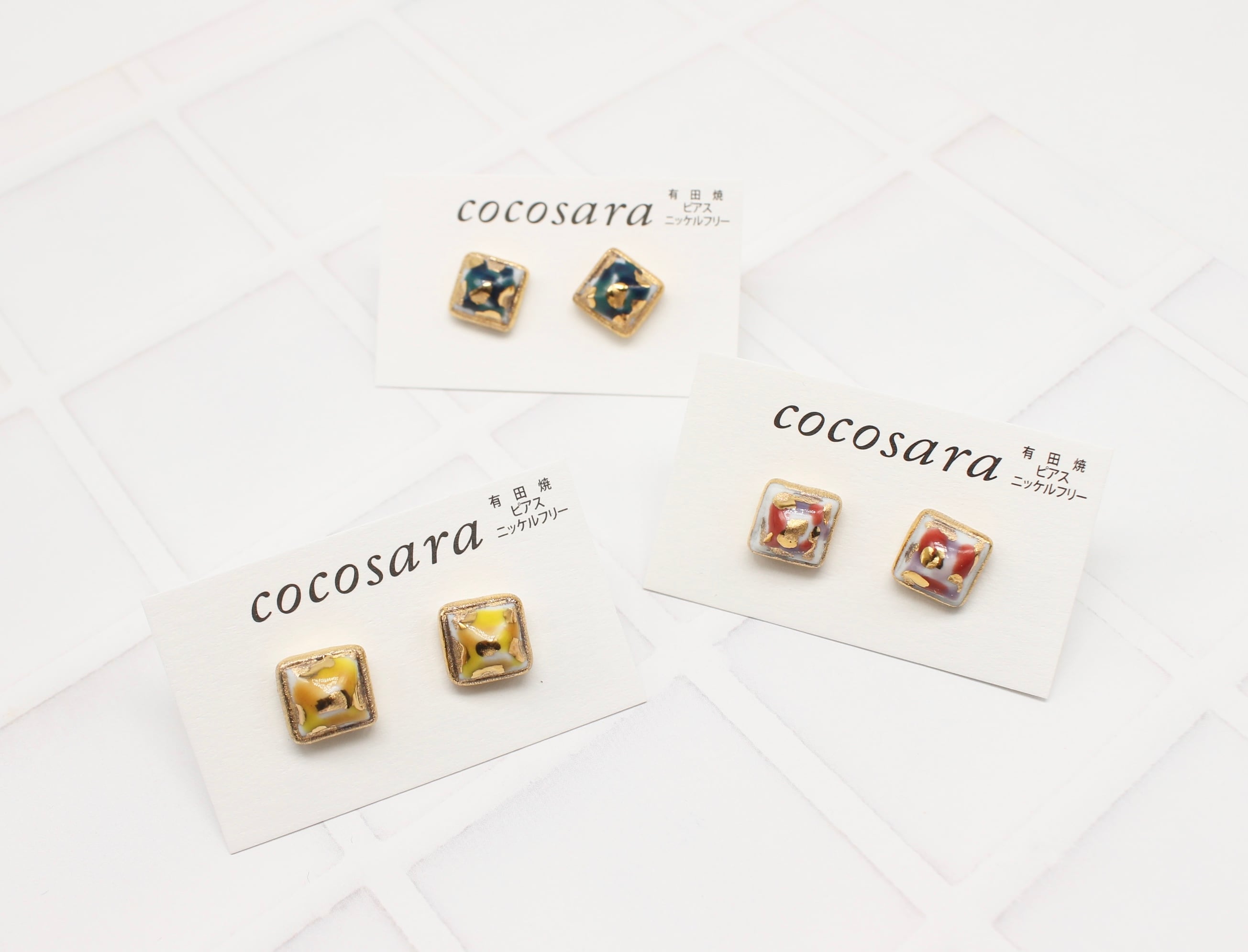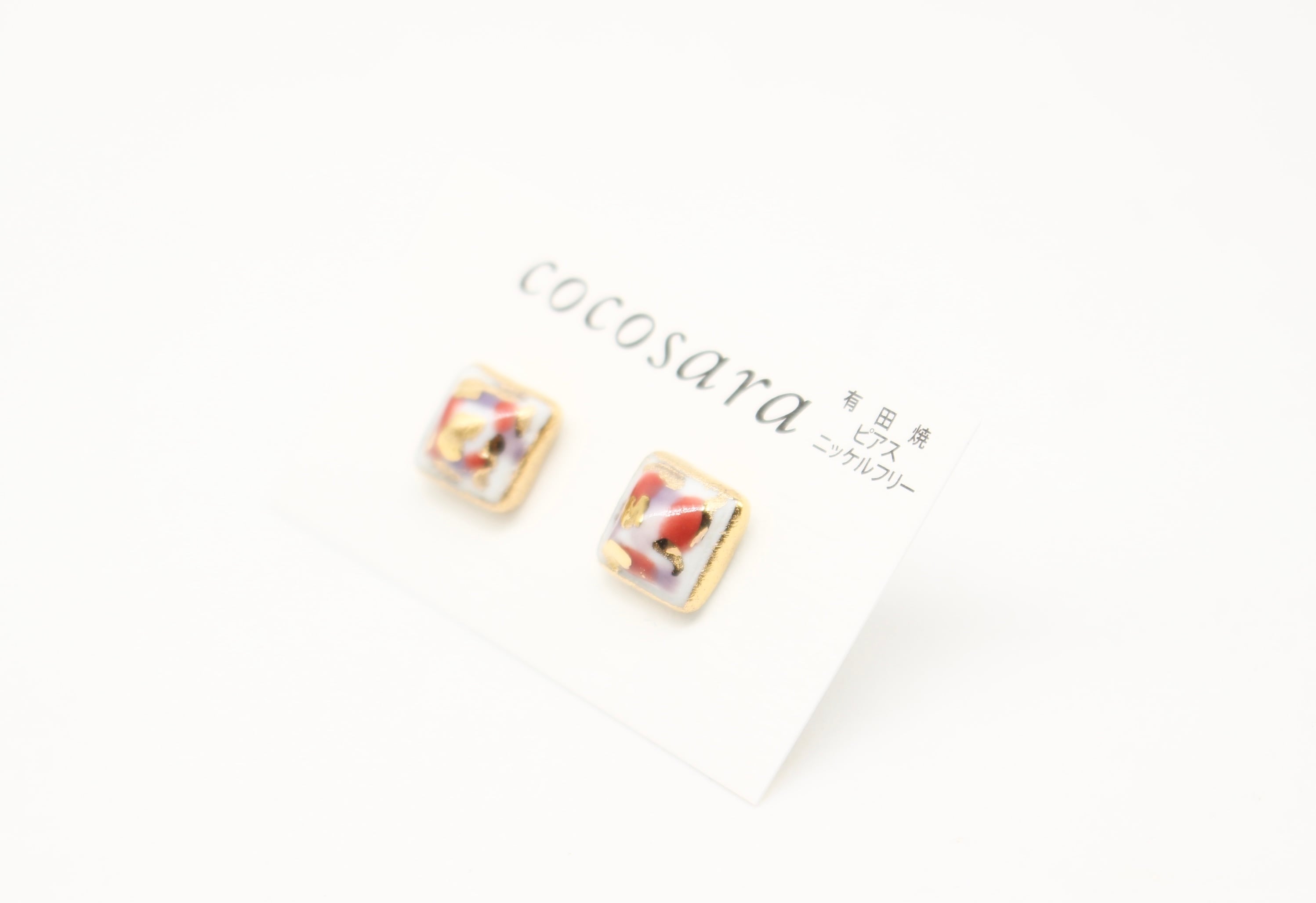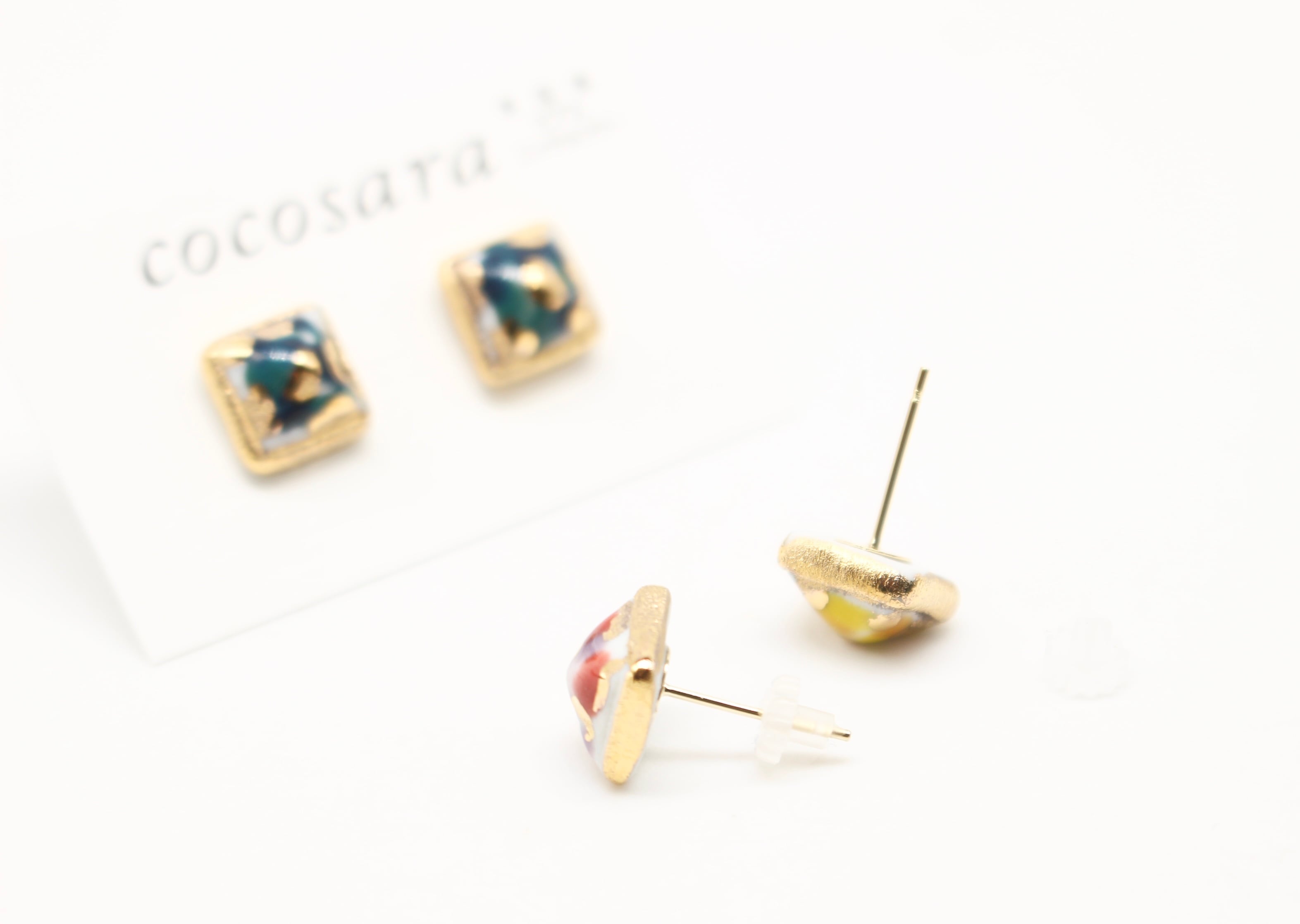 美しい有田焼ピアス です。スクエアのデザインがスタイリッシュで大人っぽい印象を与えます。特徴的な有田焼の風合いや色味を活かしたデザインなので、シンプルながらも存在感があります。一つ一つ手作業で丁寧に作られており、職人の技が光る逸品です。
