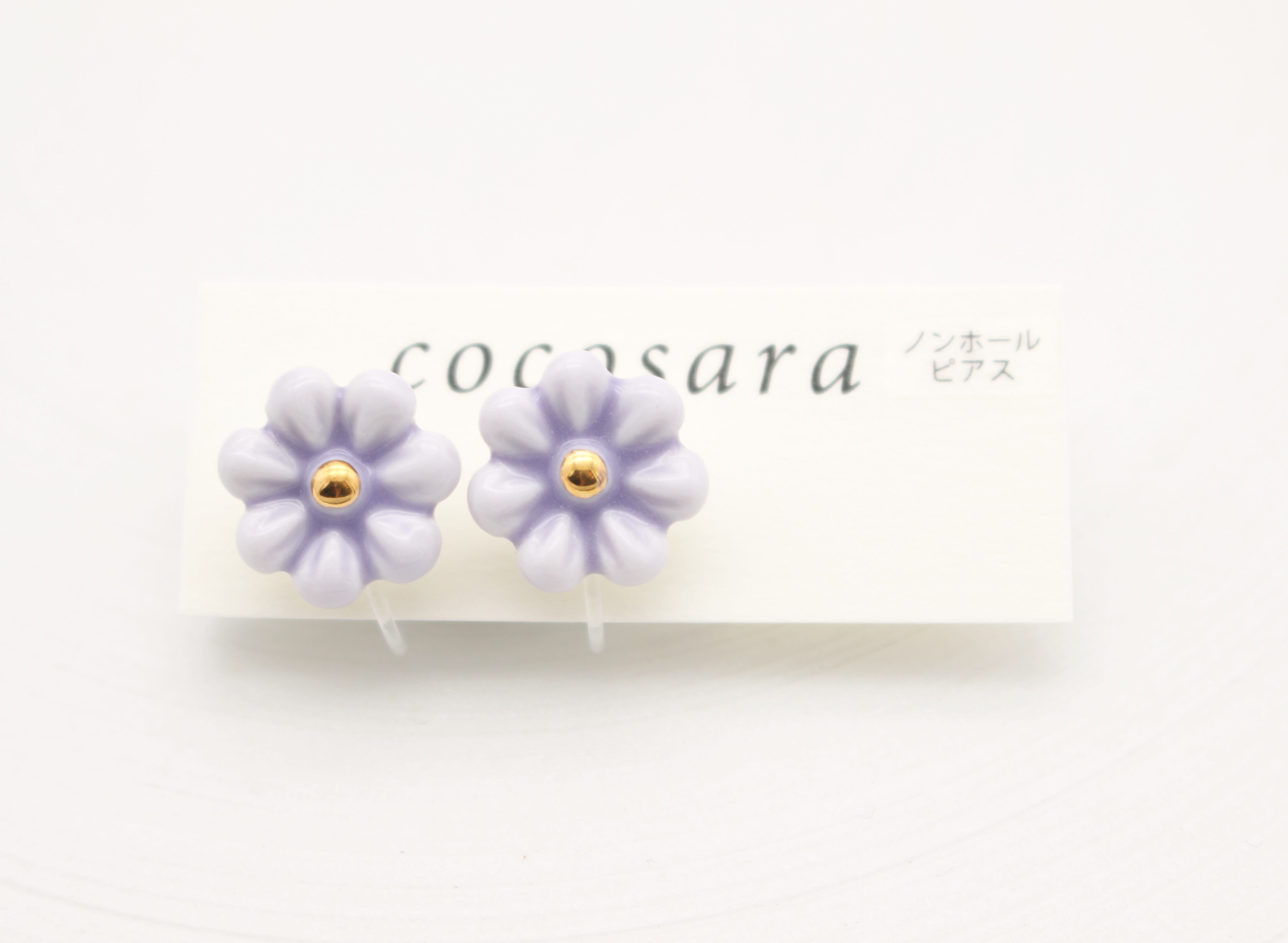 美しい有田焼の技術を活かして作られた、花の形をしたパープルカラーのノンホールピアスです。華やかで上品なデザインは、どんなシーンにも合わせやすく、おしゃれさを引き立てます。